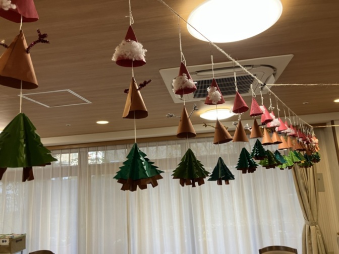 こちらの折り紙オーナメントはご入居様たちに作っていただいたものになります。