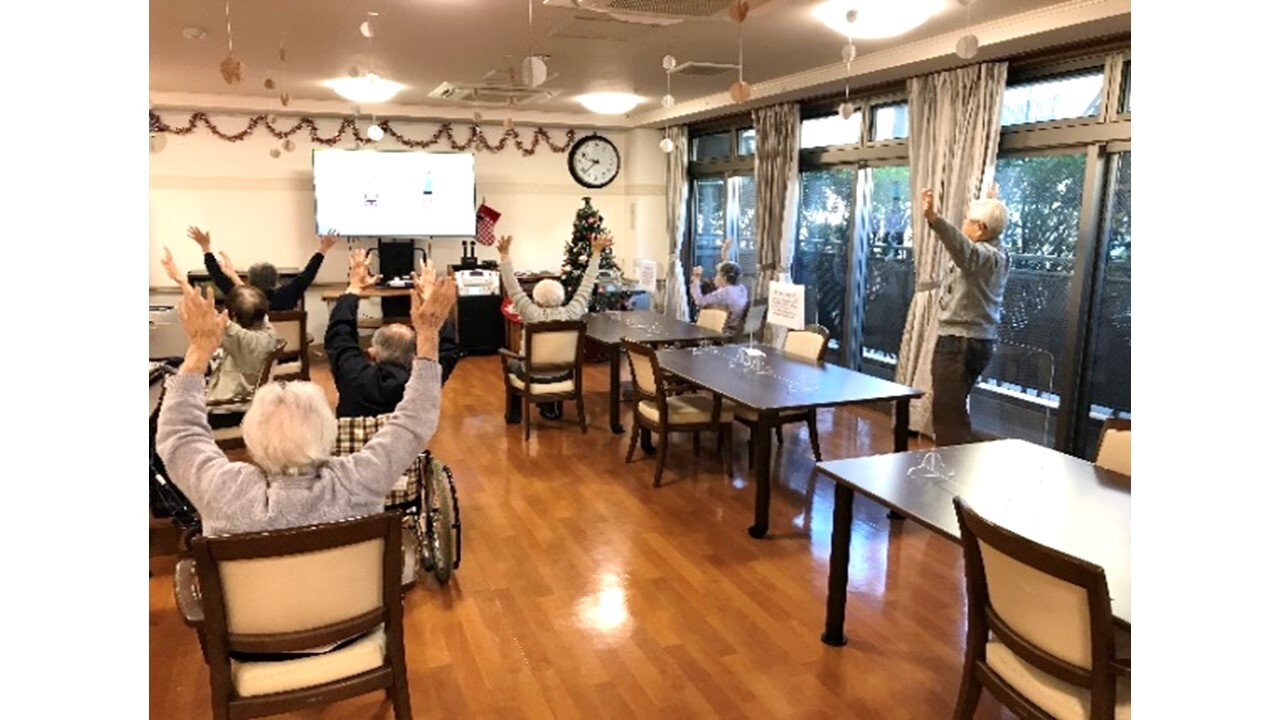 毎朝、食後に大画面テレビで映像を流し、皆さまとラジオ体操をしています。