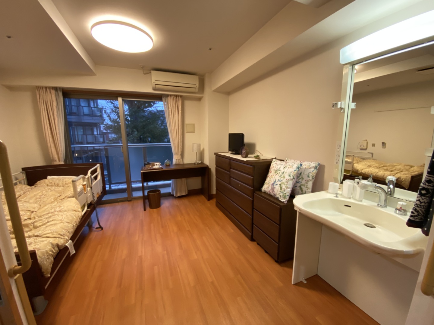 全室個室なのでご面会は24時間いつでもお気軽にお越しいただけます。居室にトイレや洗面台もあり、ご自宅と同様のプライベート空間を確保。また、緊急通報装置が各所に設置されており安心です。