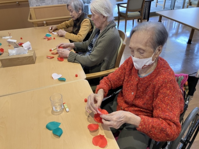 まず折り紙で作った花びらをくっつけて椿を作ります。