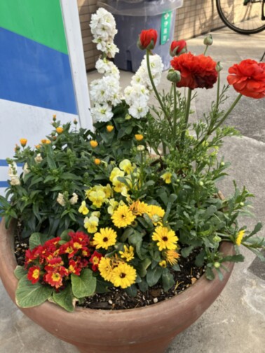 そんぽの家小平仲町の玄関前には、色とりどりの花が咲く寄せ植えが飾られています。ピンクや赤、黄色など鮮やかな花々が並び、玄関を明るく華やかな雰囲気にしてくれています。ホームに来られる方々を、やさしい春の彩りでお迎えしています。