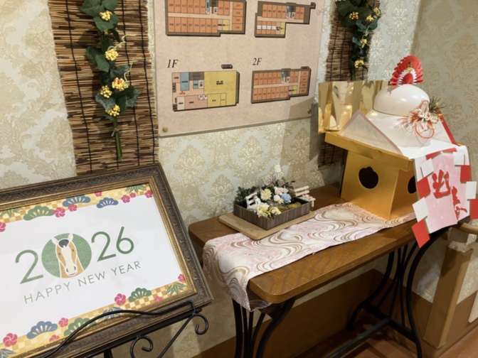 玄関は2026年を迎えるウェルカムボードと鏡餅を飾りました。