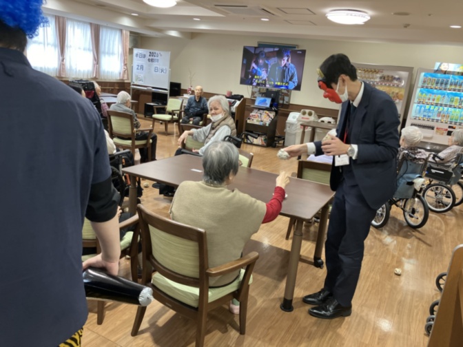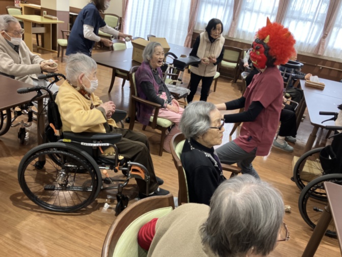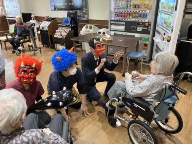 鬼が入居者様のに近づく予定が、鬼に向かって豆を投げに来られる入居者様もいらっしゃいました(笑)