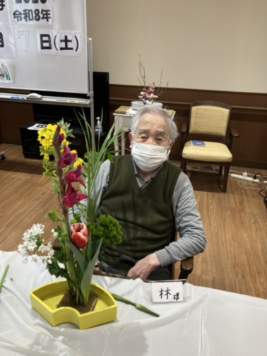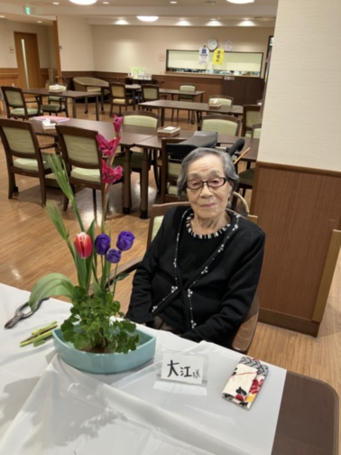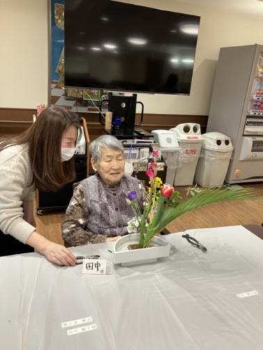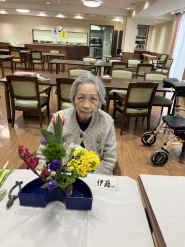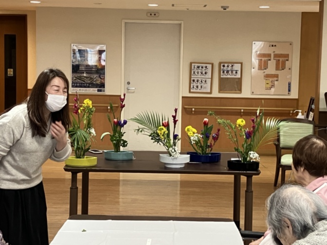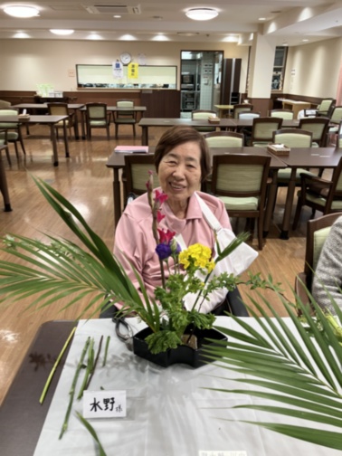各々居室に完成した生け花を持ち帰り、玄関先に飾りました。日々ご覧になって、穏やかなひとときをお過ごしくださいね!(^^)!