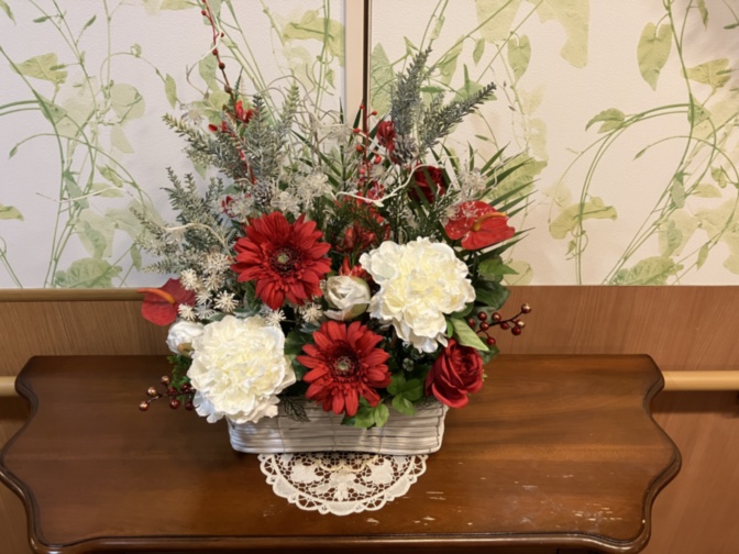 赤と白の素敵な組み合わせで所々にクリスタル調のお花が入っており