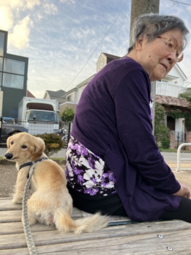 本日ご入居者様と外出した際、ご入居者様と愛犬のM様の背中合わせの姿が、