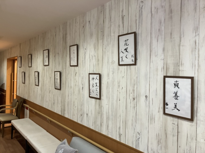 書いた作品は施設内ミニ・ギャラリーに飾りました。