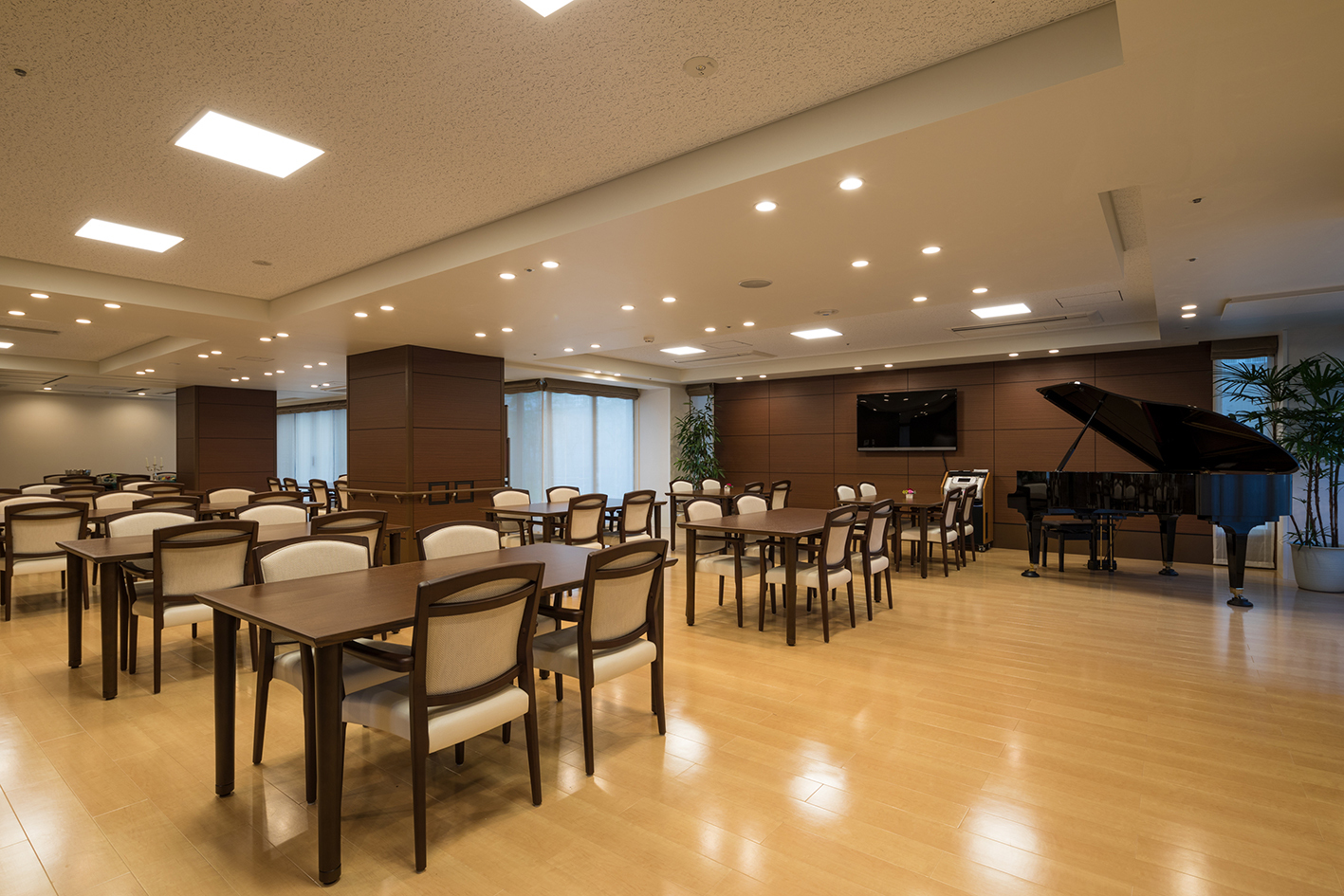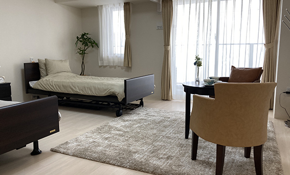 全室個室なのでご面会は24時間いつでもお気軽にお越しいただけます。居室にトイレや洗面台もあり、ご自宅と同様のプライベート空間を確保。また、緊急通報装置が各所に設置されており安心です。