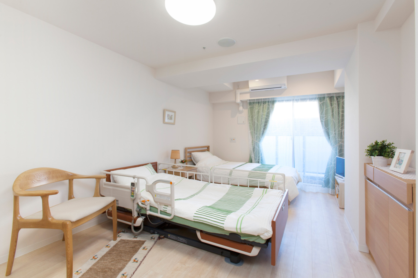 全室個室なのでご面会は24時間いつでもお気軽にお越しいただけます。居室にトイレや洗面台もあり、ご自宅と同様のプライベート空間を確保。また、緊急通報装置が各所に設置されており安心です。