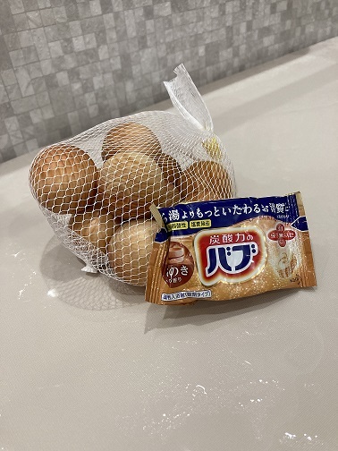 木玉を浮かせて、補助的に、檜の入浴剤を入れて