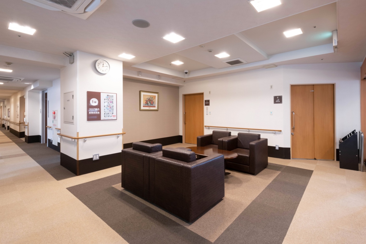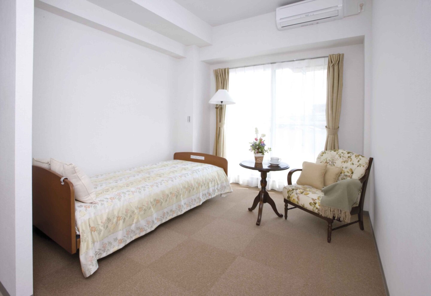 全室個室なのでご面会は24時間いつでもお気軽にお越しいただけます。居室にトイレや洗面台もあり、ご自宅と同様のプライベート空間を確保。また、緊急通報装置が各所に設置されており安心です。