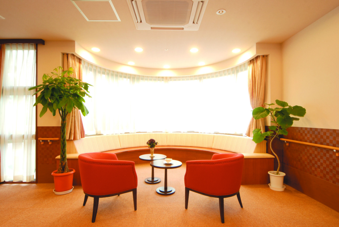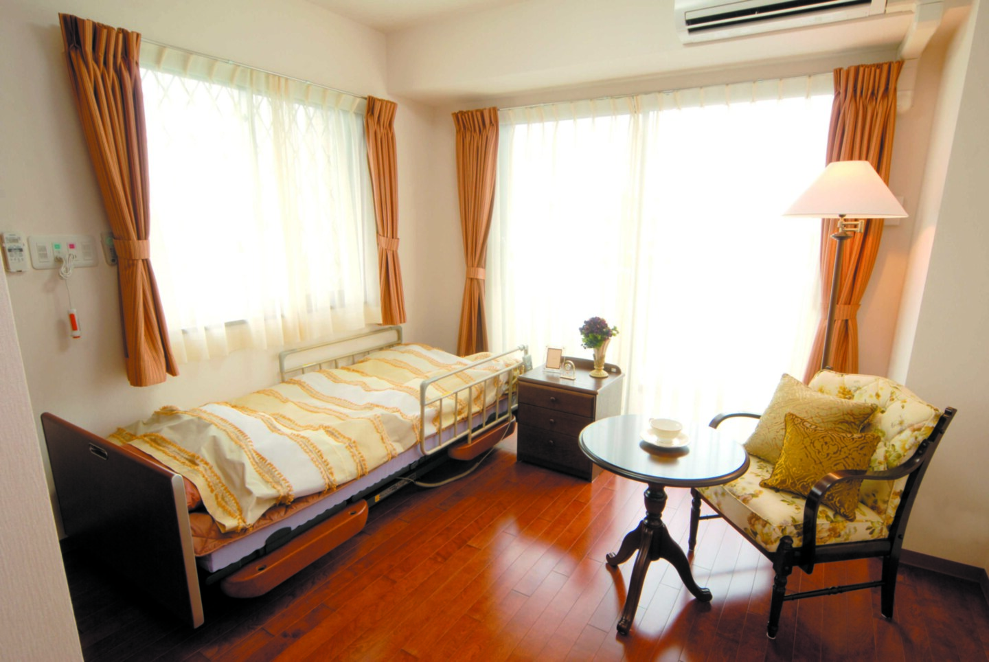 全室個室なのでご面会は24時間いつでもお気軽にお越しいただけます。居室にトイレや洗面台もあり、ご自宅と同様のプライベート空間を確保。また、緊急通報装置が各所に設置されており安心です。