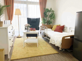 全室個室なのでご面会は24時間いつでもお気軽にお越しいただけます。居室にトイレや洗面台もあり、ご自宅と同様のプライベート空間を確保。また、緊急通報装置が各所に設置されており安心です。