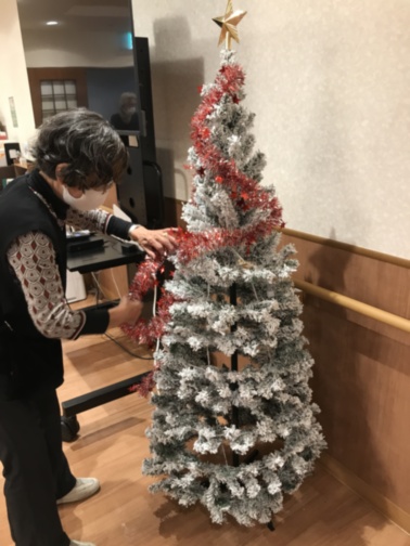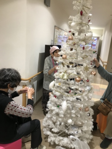 ご入居者様にもお手伝いいただき、クリスマスツリーの飾りつけをしました。