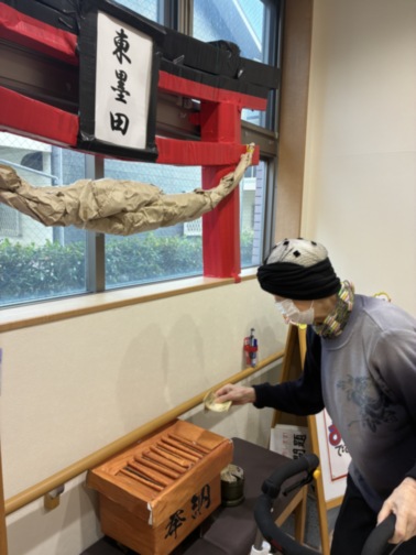 朝から大きな鳥居にお賽銭をしているご利用者様を発見!