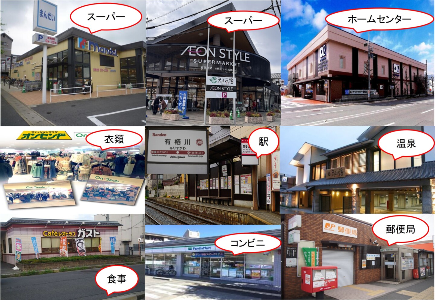 ホームから徒歩5~10分圏内に、駅やスーパーはもちろん、ホームセンターや郵便局、コンビニ、さらには温泉まで揃っており、日々の生活を豊かにする環境が整っています。ご自身のペースで気軽にお出かけを楽しめる環境です。