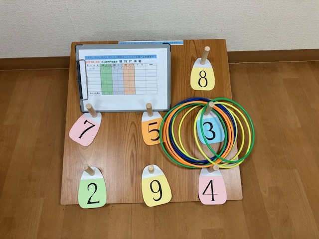 こちらも手作りの輪投げゲーム。どうです?なかなかの出来栄えでしょ?