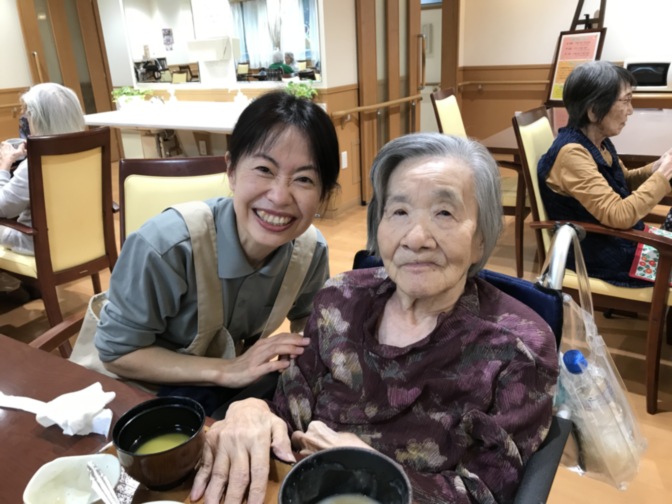 K様は、野村ヘルパーと一緒に食堂で昼食です