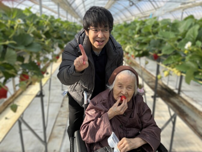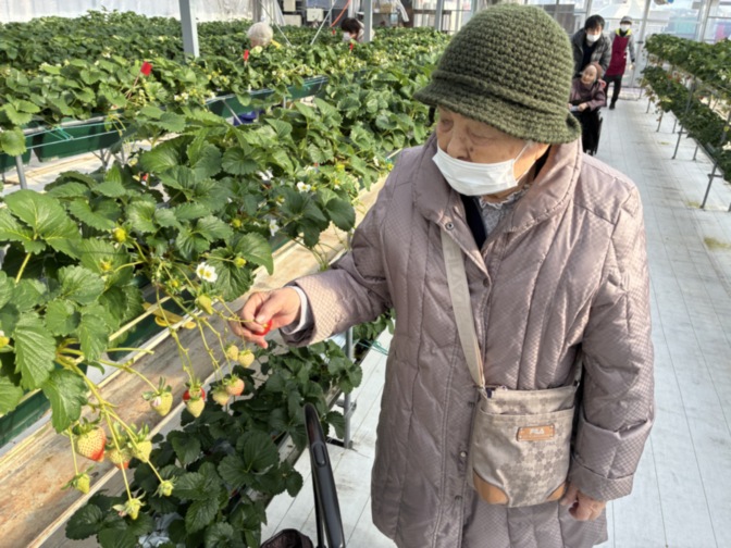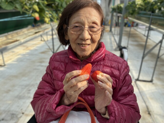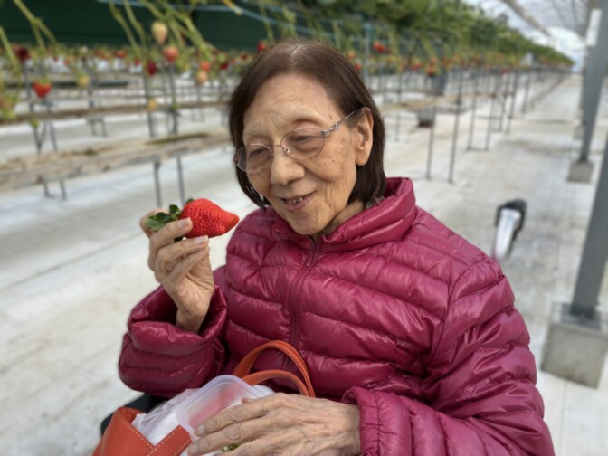 ハウスに入ると、真っ赤に実ったいちごがずらりと並び、ご入居者様も嬉しそうに手を伸ばされていました。