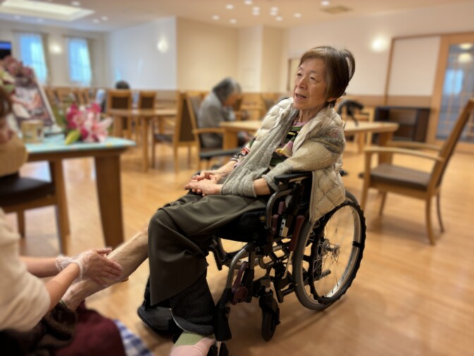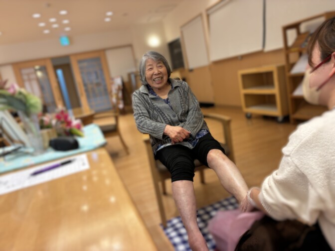 施術が始まると、ご入居者様は次第に表情がやわらぎ、「すっきりした。脚が軽くなったから腰も軽くならないかな」と笑顔で話され、ご自身でストレッチをされる姿も見られました(*^-^*)