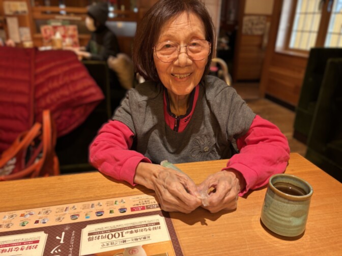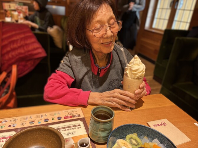 本日は、午後の空いた時間を活用して、ご入居者様と近くの喫茶店へ出かけました。店内ではクリームあんみつとフロートを注文し、ゆったりとした時間を過ごしていただきました。