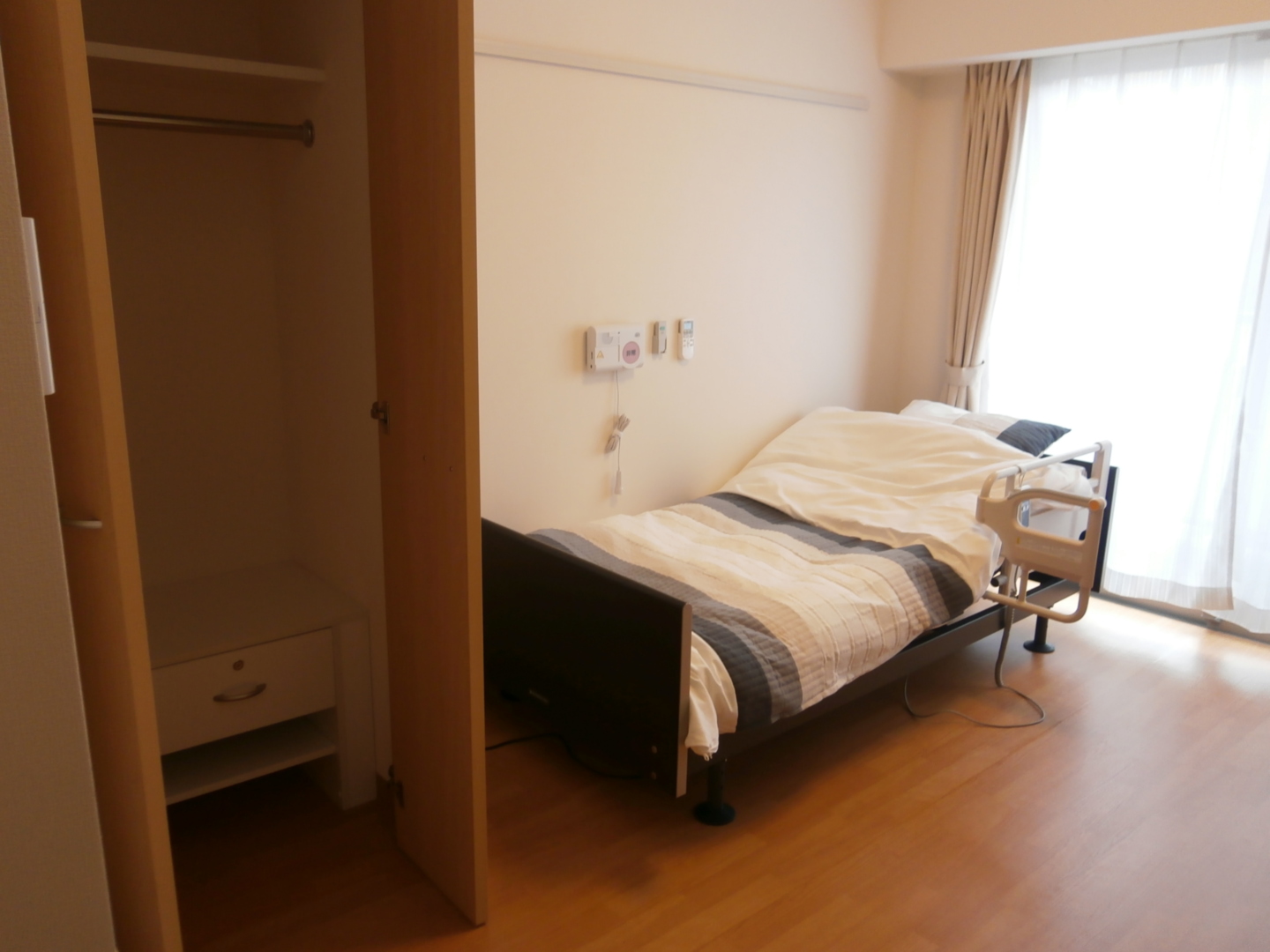 全室個室なのでご面会は24時間いつでもお気軽にお越しいただけます。居室にトイレや洗面台もあり、ご自宅と同様のプライベート空間を確保。また、緊急通報装置が各所に設置されており安心です。