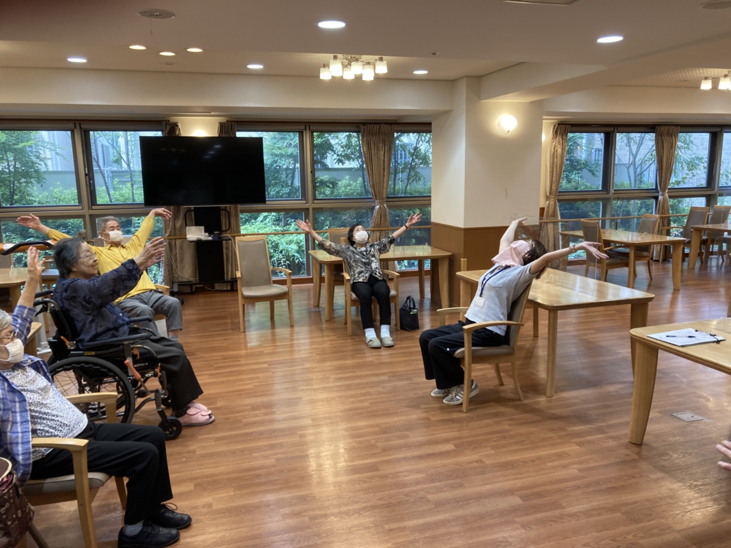 そんぽの家S城東天王田の食堂は、アクティビティを行う共有部分でもあります。体操教室、歌の会、出張デパートやオンラインでのコンサート等、ご利用者さまに喜んでいただける企画を、日々提供しております。