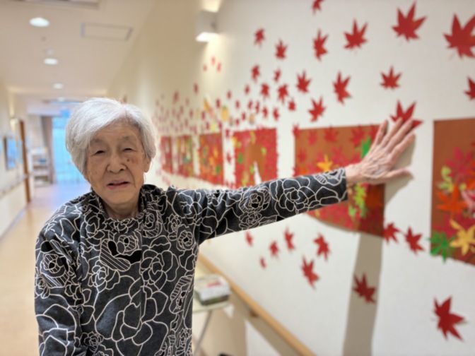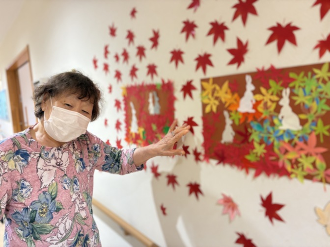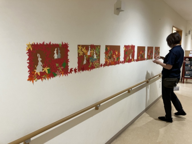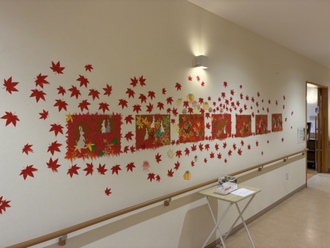 廊下に貼るための紅葉を置いておいたら、食事に来た際に皆さんが壁に紅葉を貼ってくださいました(^^♪