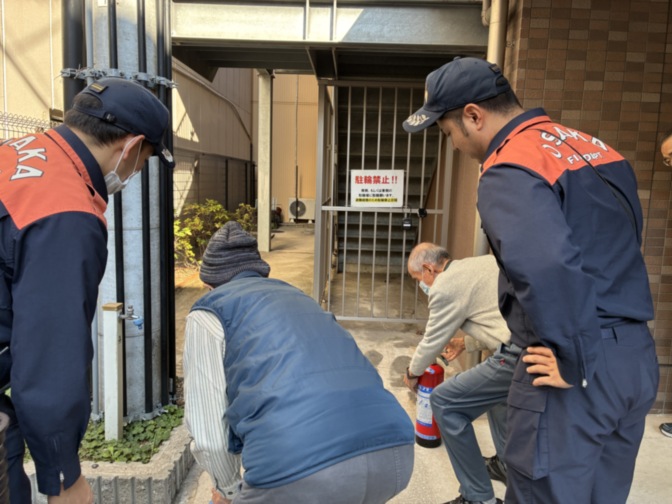 消化器を実際に使って頂いたり、非常階段のルート確認