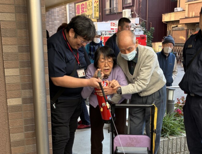 入居者様と一緒に消防訓練を実施させて頂いています。