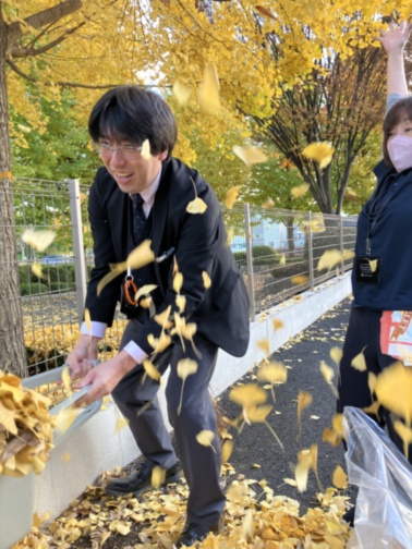 本日は色づいたイチョウ等の落ち葉を掃きました。