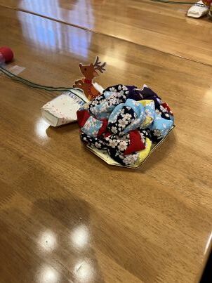 鹿(紙皿)を引っ張って障害物を乗り越えお手玉がゴールまで何個乗っているか