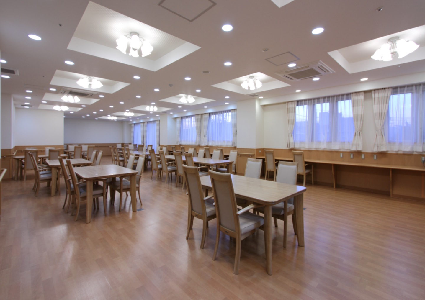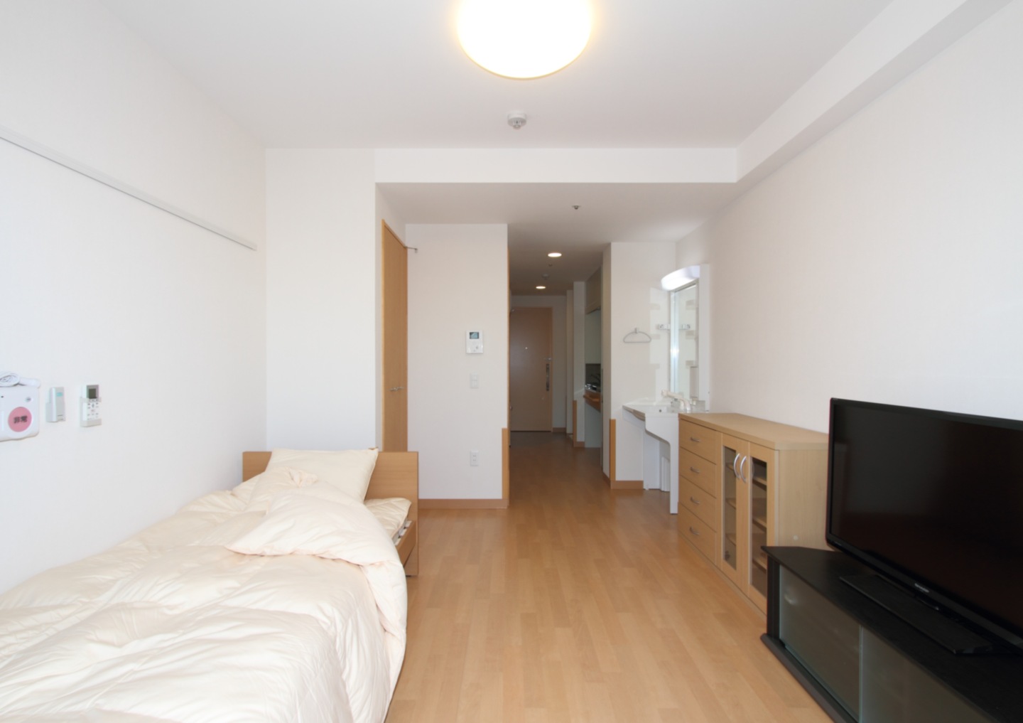 全室個室なのでご面会は24時間いつでもお気軽にお越しいただけます。居室にトイレや洗面台もあり、ご自宅と同様のプライベート空間を確保。また、緊急通報装置が各所に設置されており安心です。