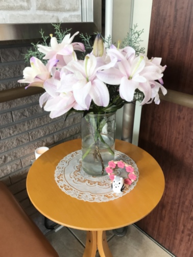 只今、正面玄関に飾っています百合の花の優しい香りが