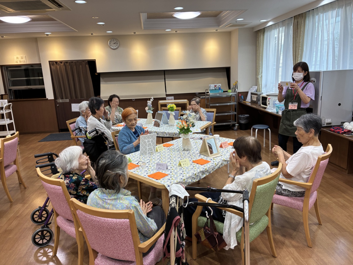 元気でお話好きなご入居者さまが多く、食事時やイベントがない時間帯でも、玄関前や食堂などでお話や井戸端会議をされています。