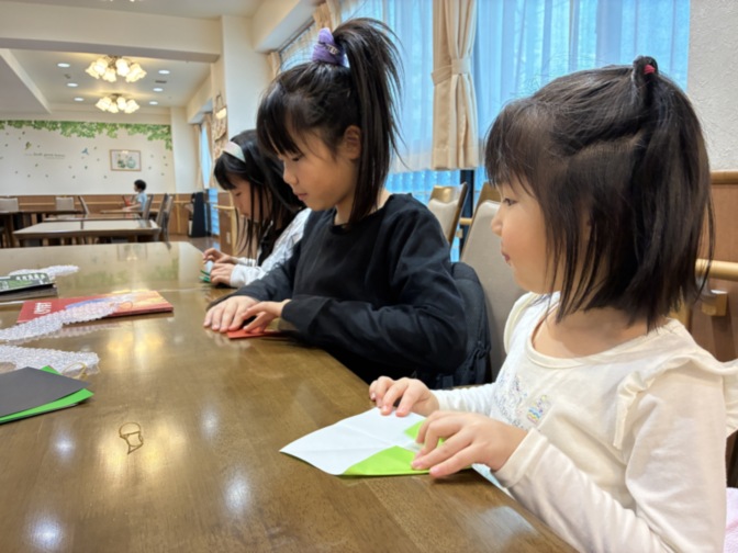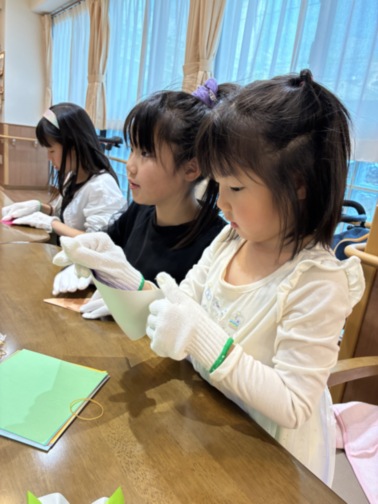 子どもたちには、折り紙を軍手あり・なしでそれぞれ折ってもらい、違いを体験してもらいました!