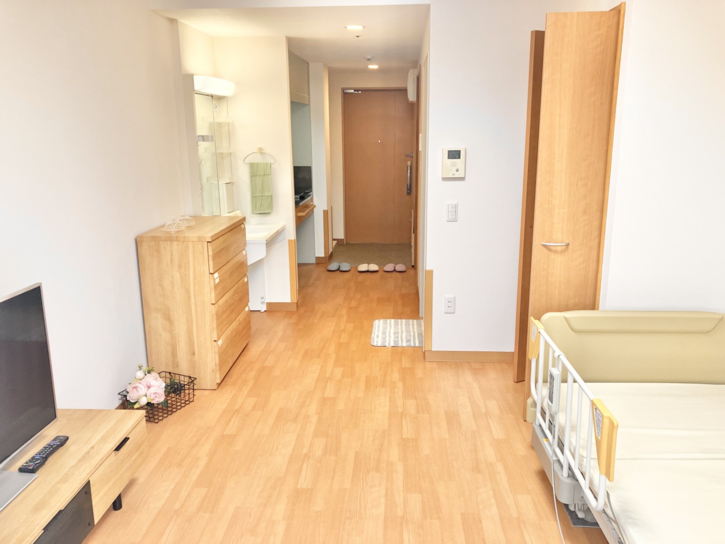 全室個室なのでご面会は24時間いつでもお気軽にお越しいただけます。居室にトイレや洗面台もあり、ご自宅と同様のプライベート空間を確保。また、緊急通報装置が各所に設置されており安心です。