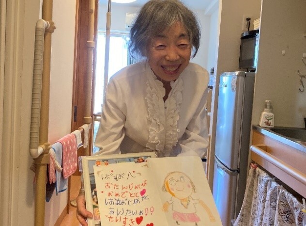 お誕生日のご入居者さまへ、ささやかなメッセージカードをお渡ししております。この日はお孫さまからもお手紙が届きましたので、一緒にお渡しいたしました。