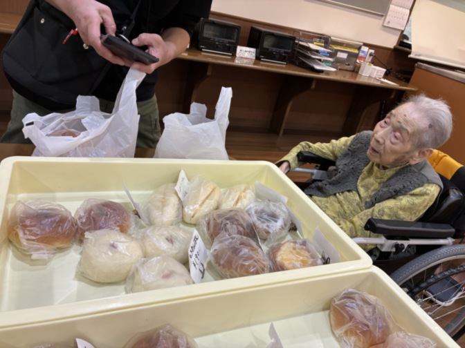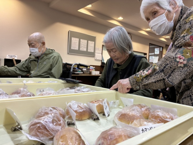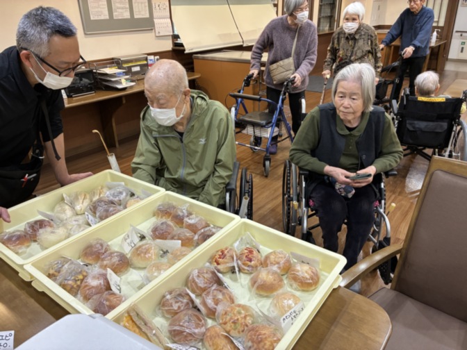 販売が始まると、食堂には焼き立てのパンの香ばしい香りがふわりと広がり、普段とは少し違う、どこか温かみのある空気に包まれました。パンを選ぶ入居者の皆さまの表情も自然とほころび、スタッフとの会話も弾み、食堂全体がやさしい雰囲気に満ちていました( *´艸`)