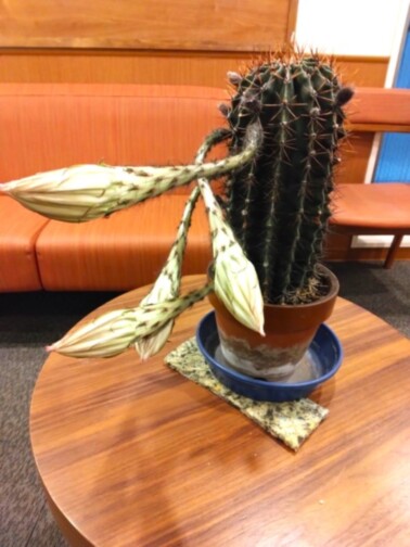 ご入居者様のサボテンが夕方に蕾がふくらみ始め、夜には五分咲き、夜中から朝にかけて白く大きな花を咲かせました~