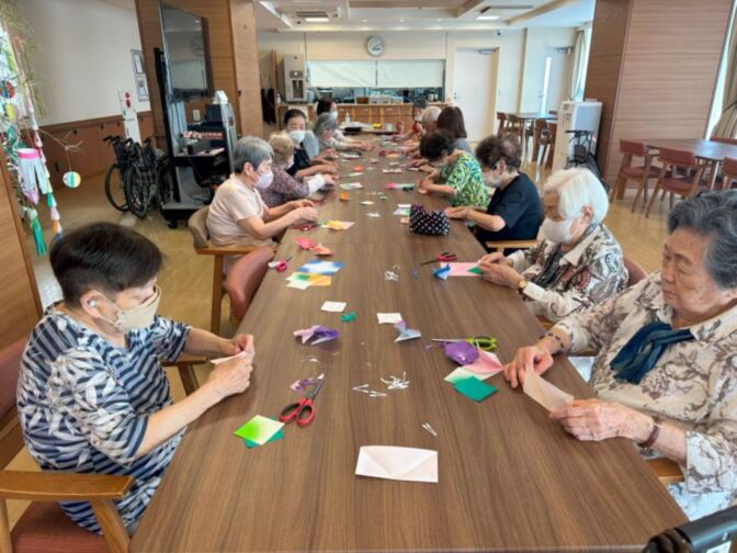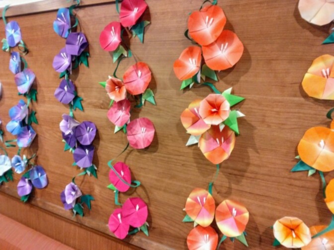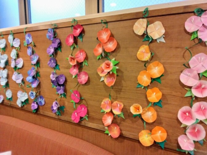 簡単な折り方の立体朝顔を沢山作りました! 食堂入口はとってもカラフルになりました~
