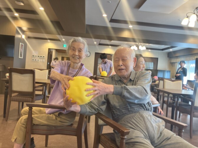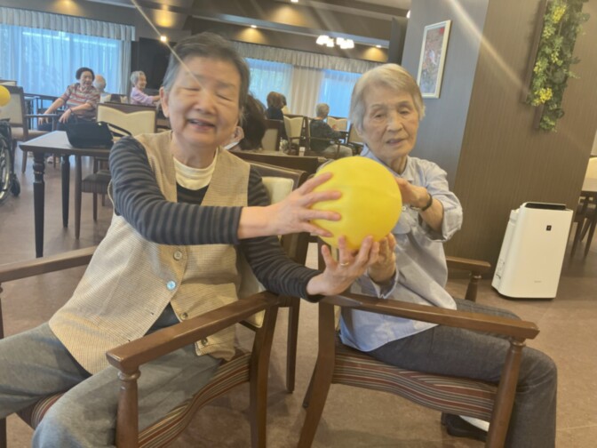 毎朝行っている体操のご様子です。今日はボールを使い、ご利用者様3名で協力して行って頂きました。