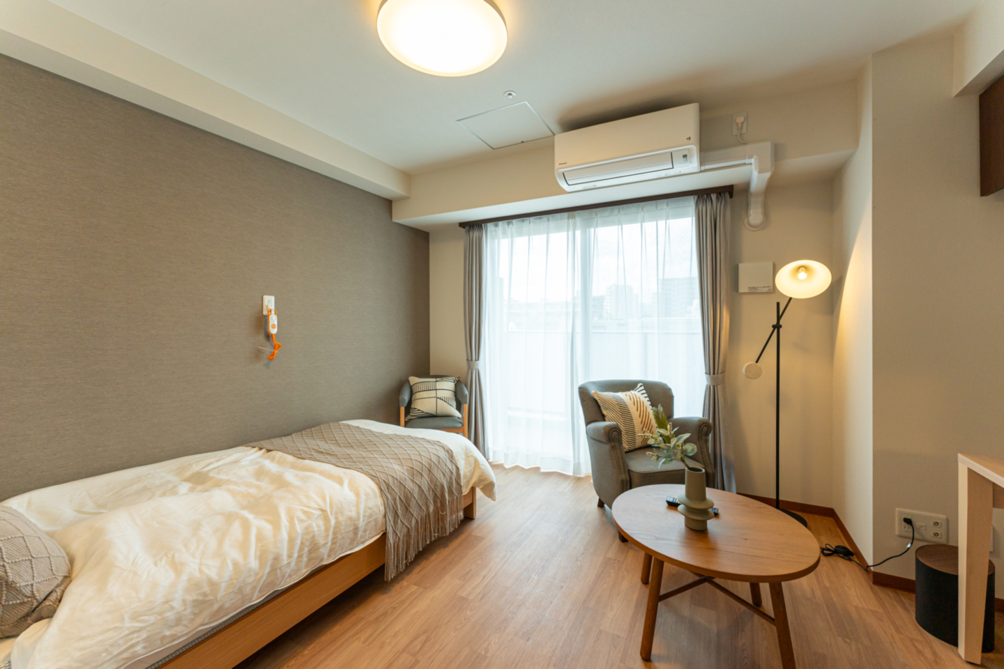 全室個室なのでご面会は24時間いつでもお気軽にお越しいただけます。居室にトイレや洗面台もあり、ご自宅と同様のプライベート空間を確保。また、緊急通報装置が各所に設置されており安心です。