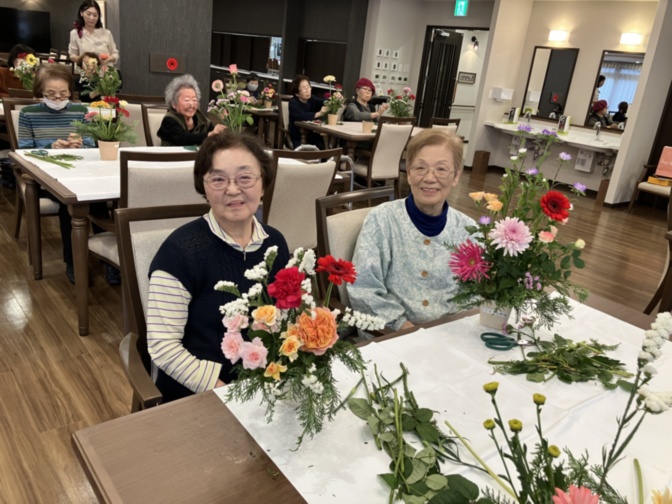 定番のカラオケ・映画鑑賞・脳トレ・ヨガに加え、季節感あふれるフラワーアレンジメント教室も開催。