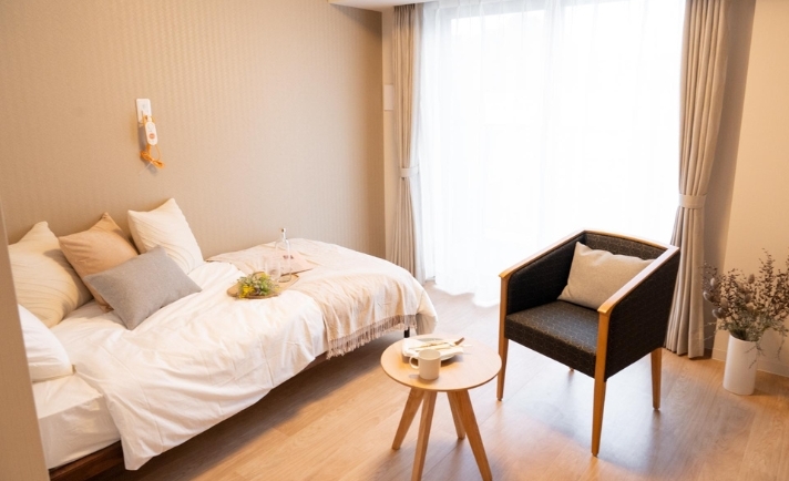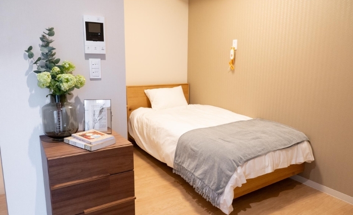 全室個室なのでご面会は24時間いつでもお気軽にお越しいただけます。居室にトイレや洗面台もあり、ご自宅と同様のプライベート空間を確保。また、緊急通報装置が各所に設置されており安心です。※一部ホームでは居室にトイレが無い場合もあります