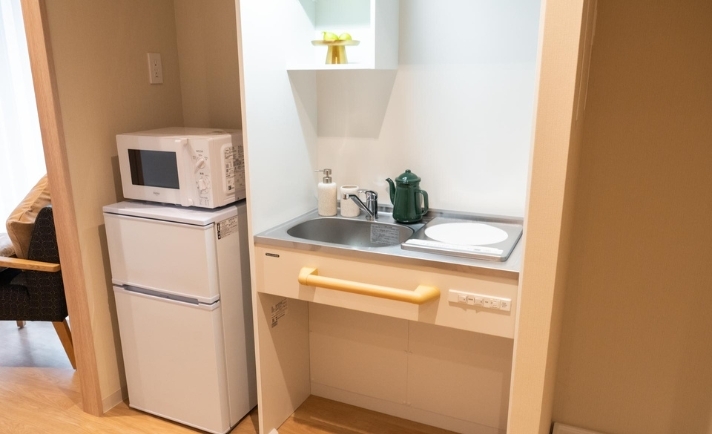 各居室にミニキッチンが備え付けになっており、お好きな料理を作ってお召し上がりいただくことが可能です。
