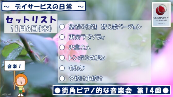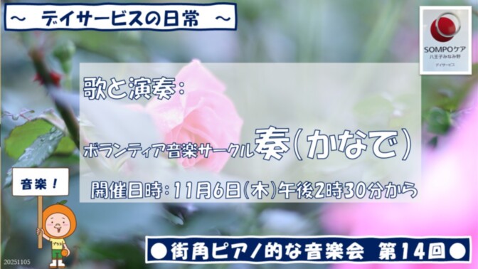デイサービスの日常 〇 街角ピアノ的音楽会 第14回 予告 〇