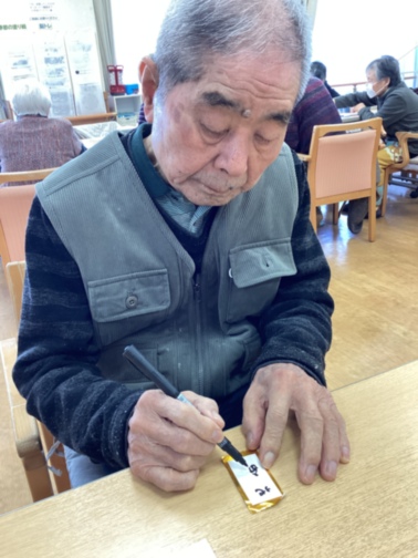 もうすぐ節分です! 2月の制作物で節分の作品作りをしました。 節分の漢字を書き鬼やヒイラギの葉っぱを飾りました。