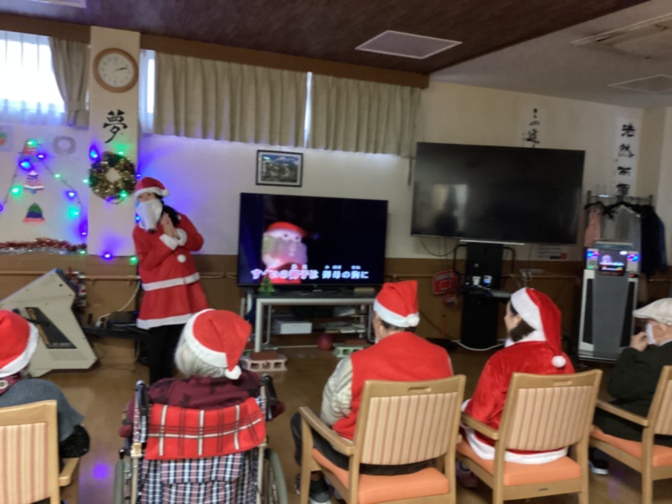 クリスマス会では、SMPOケア都町サンタクロースと一緒に全員で、「きよしこの夜」「ジングルベル」を