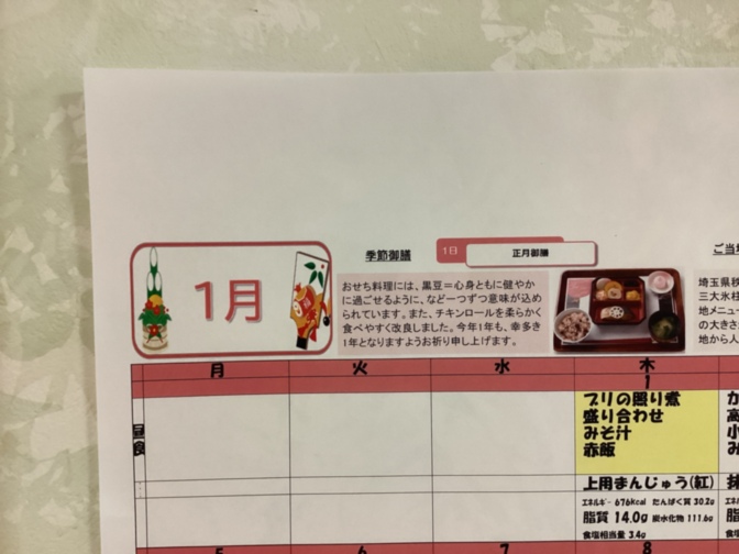 お赤飯にぶり、だて巻きに黒豆などお正月らしいお料理がでました。